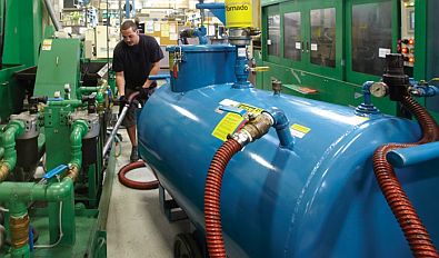 The job of cleaning out the machines' sumps originally fell strictly to manual labor. Each machine has three separate tanks, and it took eight to 11 hours to clean them out. Workers would use an air pump for the liquid, then shovel and scoop out the chips and fines by hand and finally wipe out the tanks with rags. The tanks on each machine vary in capacity, ranging from 30 to 80 gallons. With 27 machines and three tanks per machine, crews were disposing of almost 4,500 gallons of cutting oil by hand per change-out.