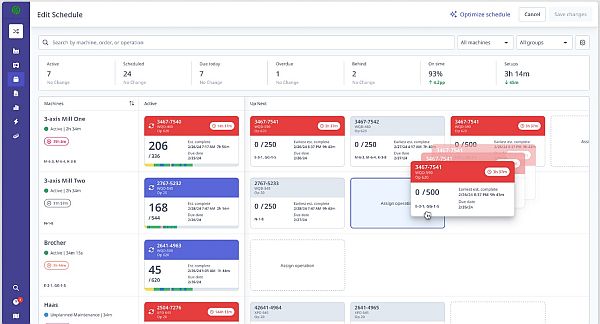 Planners and supervisors can now see whether jobs are tracking ahead or behind plan at any moment. When something slips -- a setup runs long, a machine alarms, or a tool change takes longer than expected -- they can re-sequence work, move jobs, or adjust priorities before the schedule derails.