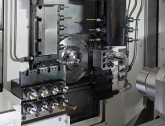 For high-volume production of small, precise motorsports parts, Mazak's SYNCREX 38/9 Swiss-Type Turning Machine is built on High Damping Composite Casting (HDCC). The unique high-rigidity base provides greater vibration-damping characteristics, less thermal growth, longer tool life and greater part surface capabilities than cast iron base machines.
